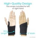The wrist wraps provide stabilising support for painful wrists, relieving pain caused by strains and sprains, arthritis, tendonitis, tendinopathy, ganglion cysts, and carpal tunnel. Each wrap contours to the wrist and has a flexible thumb loop that can be adjusted for a custom fit. Hand washable, the two wrist wraps are lightweight and breathable, providing outstanding comfort during daily activities such as exercising, typing, gardening, and more.